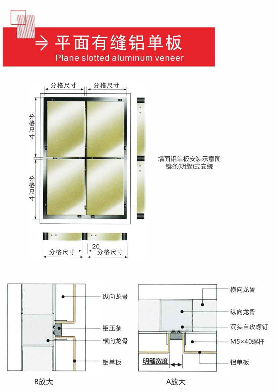 3、安装铝单板:按要求安装好铝单板,四周角码均用自攻螺钉固定,再镶入铝压条。